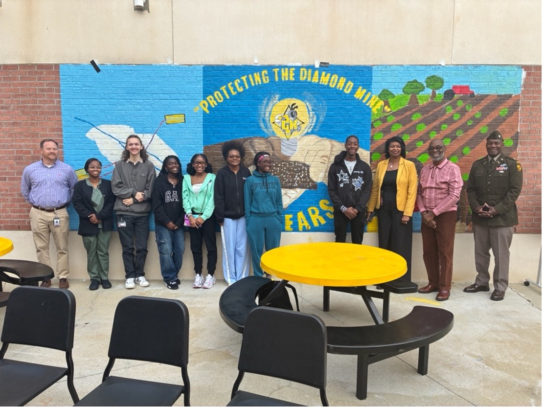 The mural was created in honor of Lower Richland High School's centennial celebration and the proclamation of September 24th as Energy Justice Day in Richland County, raising awareness about the disparities in access to clean, affordable energy throughout South Carolina.