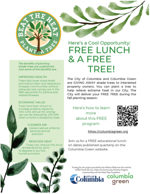 To address extreme heat issues and limited tree canopies, The City of Columbia and Columbia Green have initiated the Beat the Heat - Plant a Tree Campaign. This joint effort aims to plant trees on private property at no cost over the next five years in Columbia. The Campaign began with a luncheon, one of twenty events planned to educate residents on planting and caring for trees on their property. The Smart Surfaces Team provided raffle prizes and shared outreach materials on smart surface methods such as trees, urban meadows, and rain gardens to help manage extreme